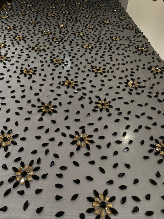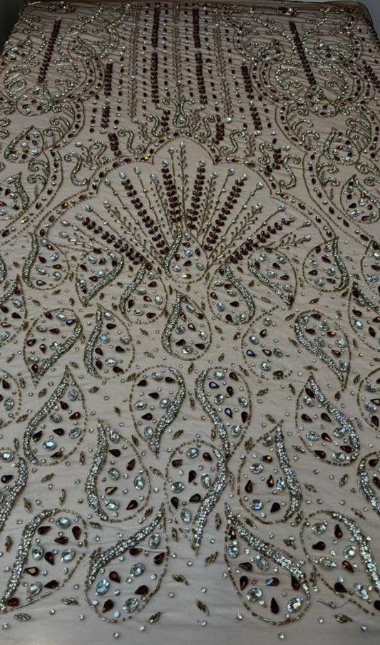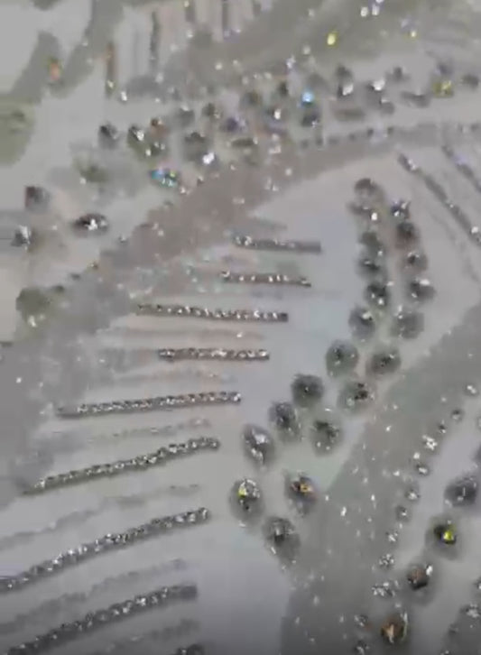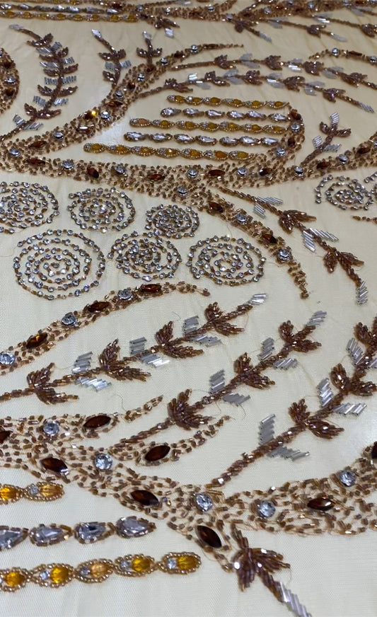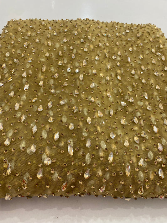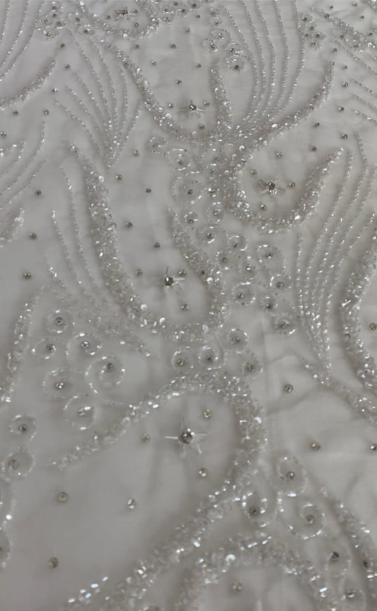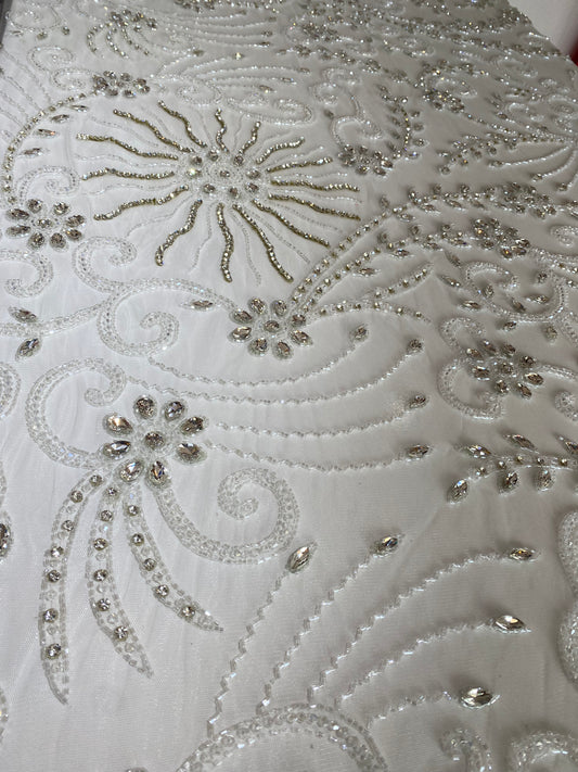 High-quality lace with exclusive designs embellished with gemstones and crystal beads is available in four-yard lengths.